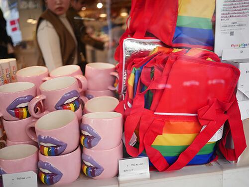 ガラス越しのカフェで、色とりどりの口紅をあしらった口のイラストが描かれたコーヒーカップが、棚に無造作に並んでいる。